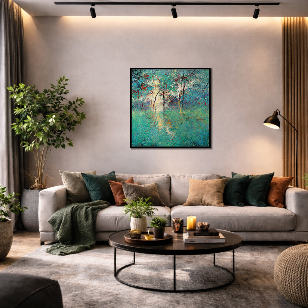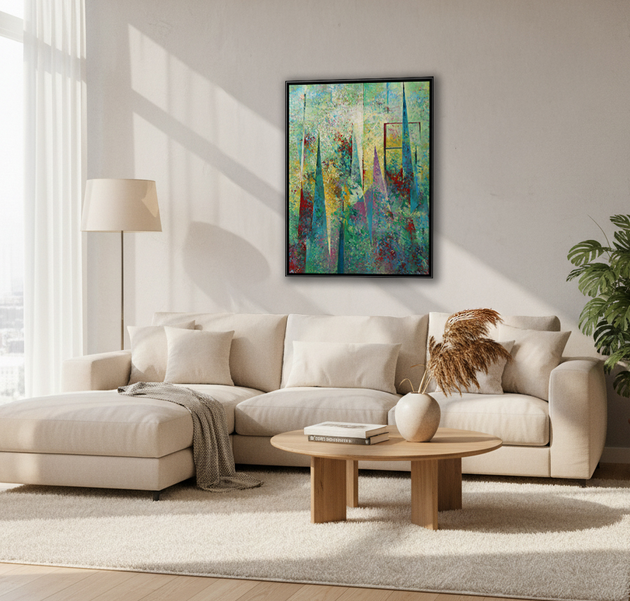 *Poniżej wizualizacje obrazu z ramą i we wnętrzu wygenerowane przez AI